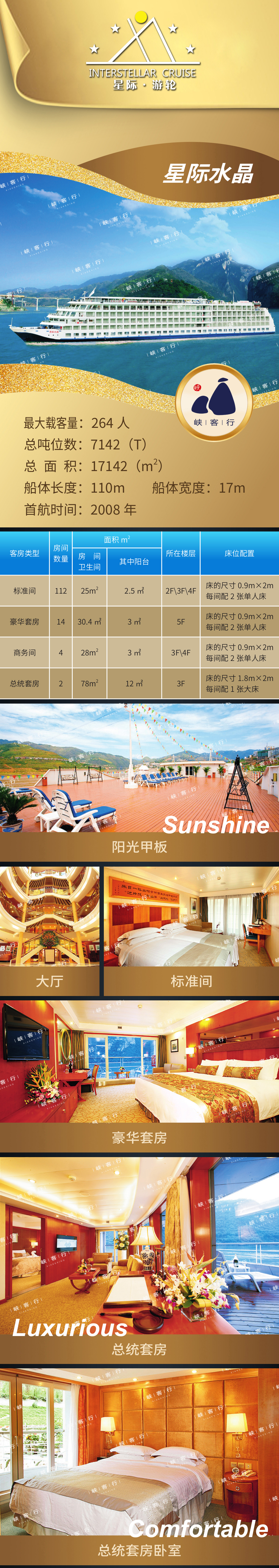 “星際水(shuǐ)晶号”遊輪原隸屬于新世紀遊輪公司,其前身(shēn)是(shì)“世紀鑽石号”,于2019年(nián)更名為(wèi)星際水(shuΩǐ)晶号,是(shì)長(cháng)江高(gāo)端五星豪華遊輪。按照(zhào)國(guó)際高(gāo)↑品質标準設計(jì)建造裝修,擁有(yǒu)全樓空(kōng)五層透明(míng)大(dà)堂,視(shì)野開(kāi)闊。超↑大(dà)江景露台客房(fáng),全部采用(yòng)五星國(guó)際酒店(diàn)标準配置,舒适溫馨。豪華典£雅的(de)全景餐廳,浪漫光(guāng)影(yǐng)的(de)咖啡酒吧(ba),全程為(wèi)你(φnǐ)提供經典中餐和(hé)精美(měi)的(de)純西(xī)式點菜服務。垂涎欲滴的(de)各類中西(xī)式精美(měi)佳肴、豐富多(duō)彩的(de)≤娛樂(yuè)活動、服務設施應有(yǒu)盡有(yǒu),将這(zhè)裡(lǐ)變成一(yī)個(gè)溫馨舒适、浪漫迷人(rén)的(de)水(shuǐ)上(shàng)樂(yuè)園。