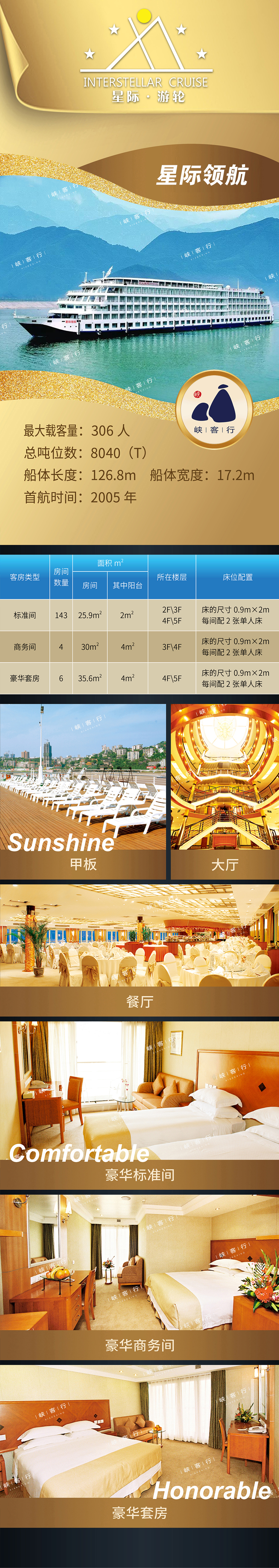 “星際領航”号的(de)前身(shēn)是(shì)“世紀輝煌”号,于2021年(nián)更名,當時(shí)一(yī)面世就(jiù)被歐洲媒體(tǐ)公認為(wèi)內(n<èi)河(hé)最大(dà)、最高(gāo)端豪華的(de)遊輪。船(chuán)上(shàng)設施設備、裝修設計(jì)均完全一(yī)緻。全船(chuán)♥裝飾别緻、風(fēng)格典雅,美(měi)觀大(dà)方。擁有(yǒu)氣勢恢弘、雍容華麗(lì)的(de)5層高(gāo)透空(kōng)旋轉大(dà)堂;品質純正、歐∑美(měi)進口的(de)餐具、廚具;簡潔寬敞、方便舒适的(de)歐式整體(tǐ)浴室;臨江面水(shuǐ)、曲線玲珑的(de)全落地(dì)式獨立歐式陽台>;配置輕松便捷的(de)休閑網吧(ba)。這(zhè)艘高(gāo)端豪華的(de)內(nèi)河(hé)遊船(chuán)随之帶來(lái) 的(de)舒适體(tǐ)驗,将帶給您高(gāo)品質的(de)三峽之旅。